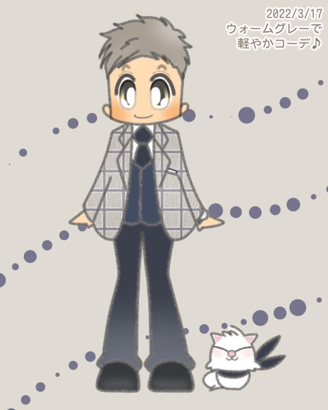 チャコールグレーに薄めの白のチェック柄のスリーピース(ジャケットは《横からひらひらモード》)、