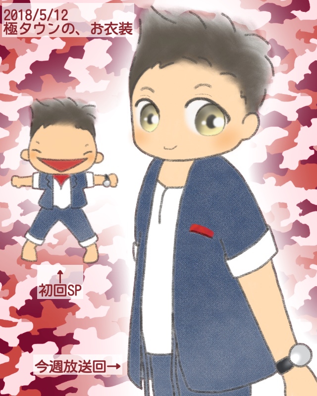 白シャツ、赤を基調とした胸元チーフ(初回では首元に巻いてたのと同じ、はず)、
