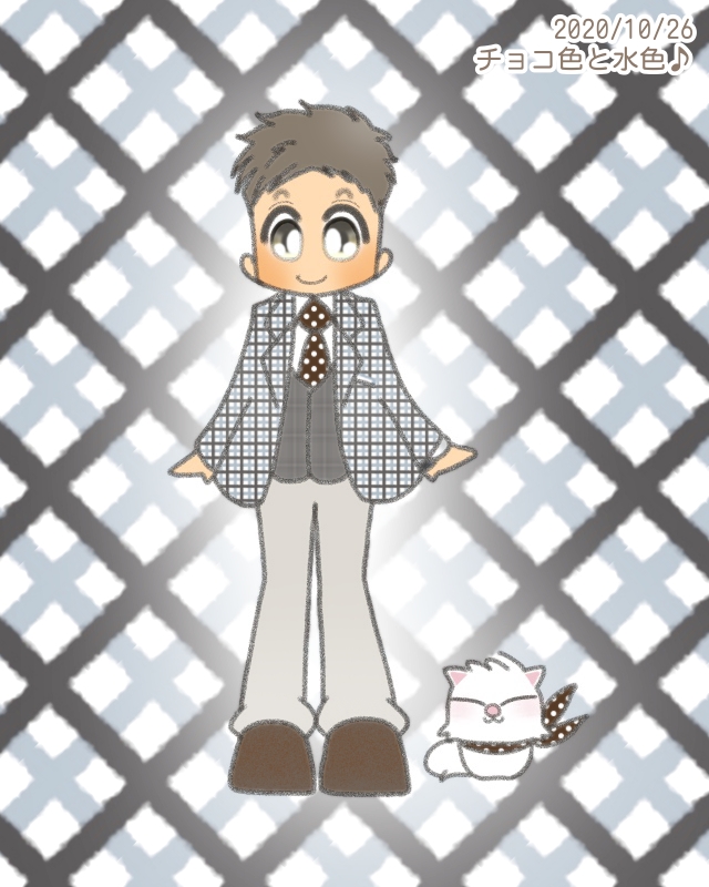 ベージュに水色とチャコールグレーのチェック柄のジャケット、