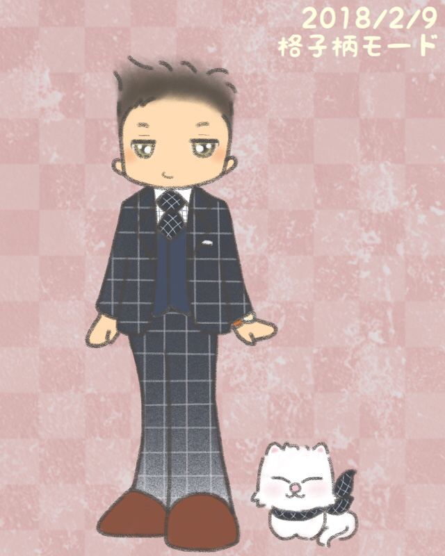 白襟に紺の正方形格子柄のシャツ、紺に白の大きめ格子柄の上下、