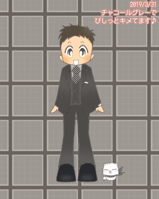 チャコールグレーの上下とベスト、