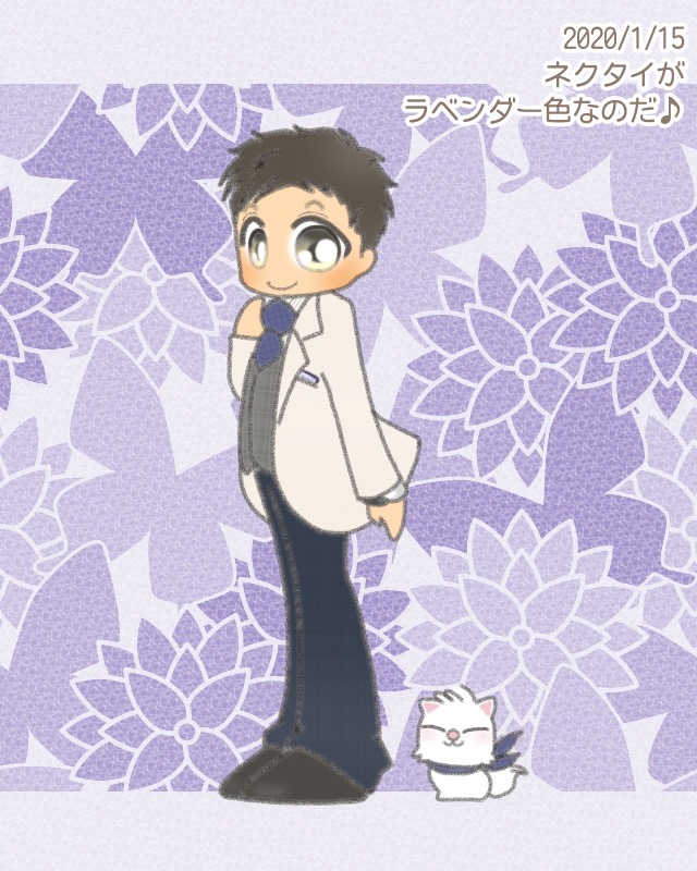 濃淡ラベンダー紫(やや黒寄り)の細かい模様に濃い紫縁取りの胸元チーフ、