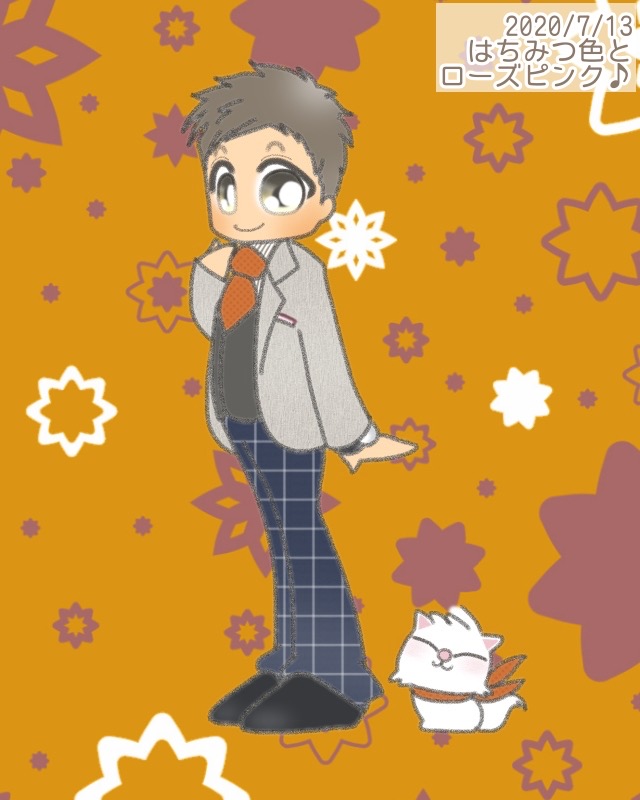 淡いピンクにローズピンク縁取りの胸元チーフ、