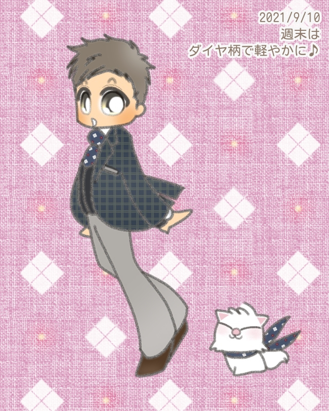 紺に白ダイヤ柄と赤水玉(?)のネクタイ、