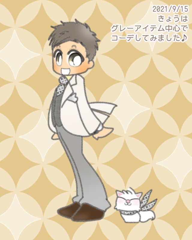 シャツ+ジャケット+お靴を茶系(イエロー系)で対比させてるのが