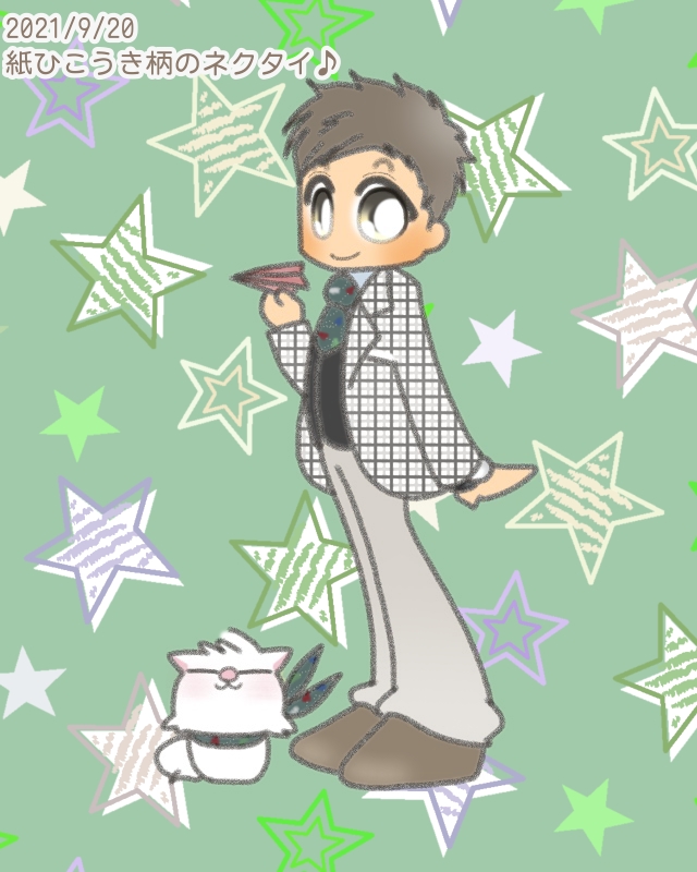 「紙ひこうき柄」のかわいいネクタイがポイントのコーデからスタートですね♪