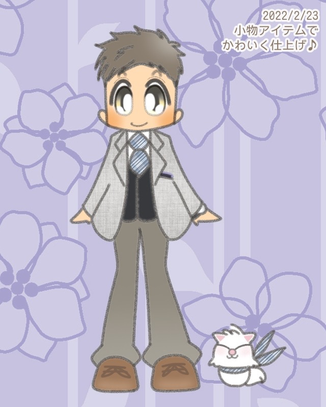 濃い紫にラベンダー縁取りの胸元チーフ、