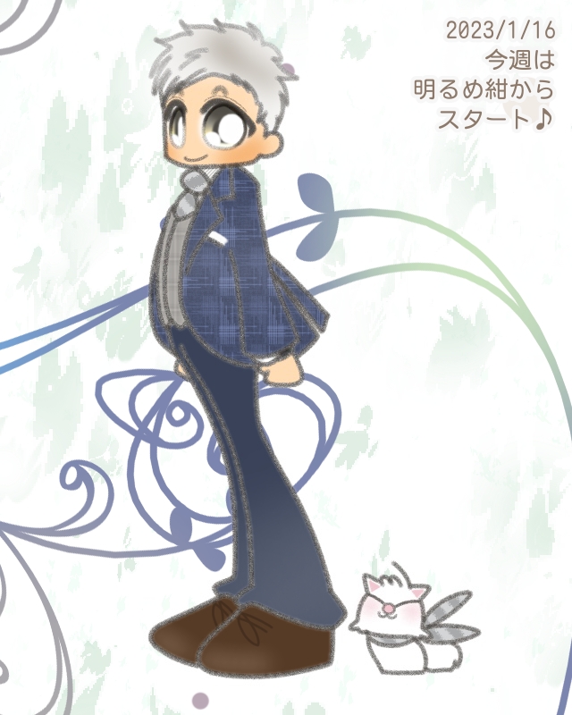 明るめ紺に白のかすり風チェック柄の《横からひらひらモード》のジャケット、