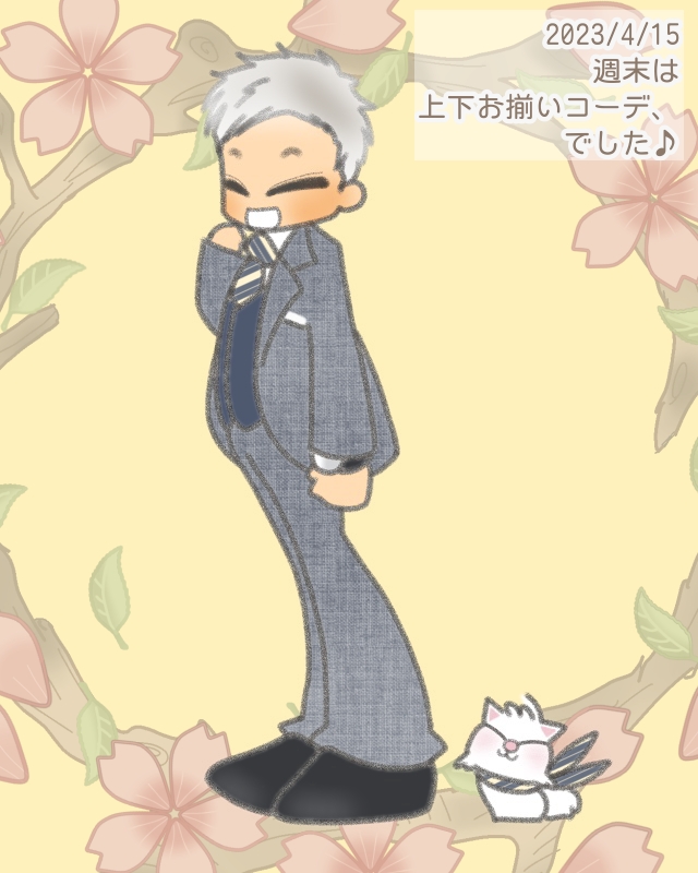濃紺の上下(ジャケットは《横からひらひらモード》)、